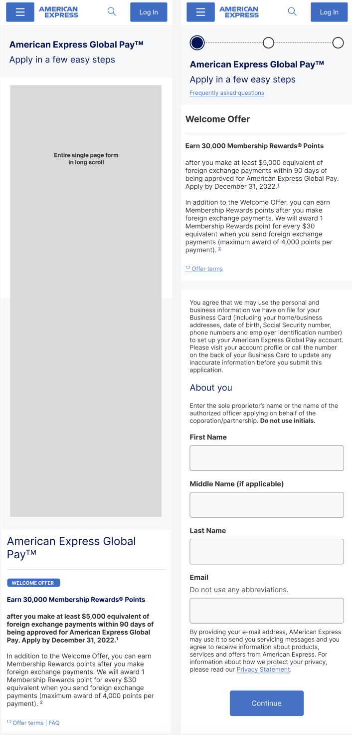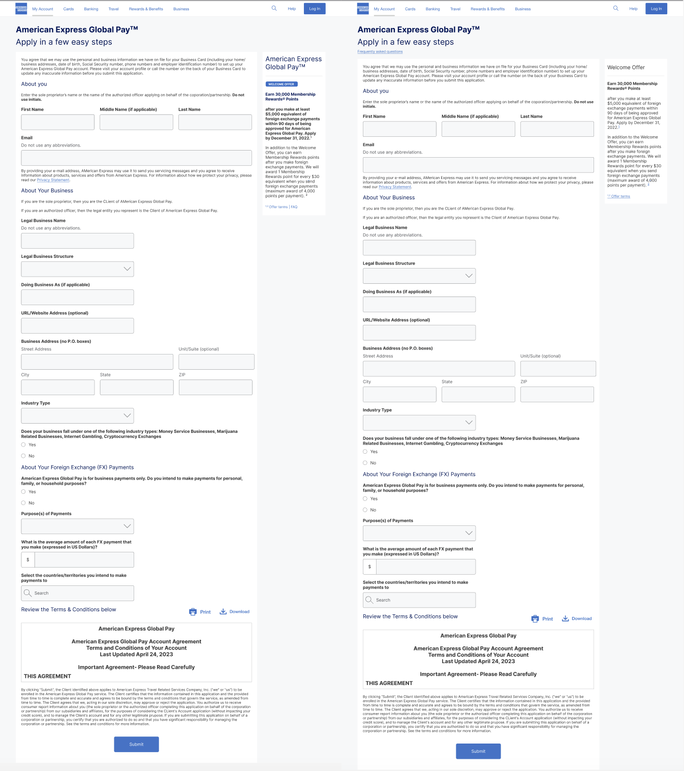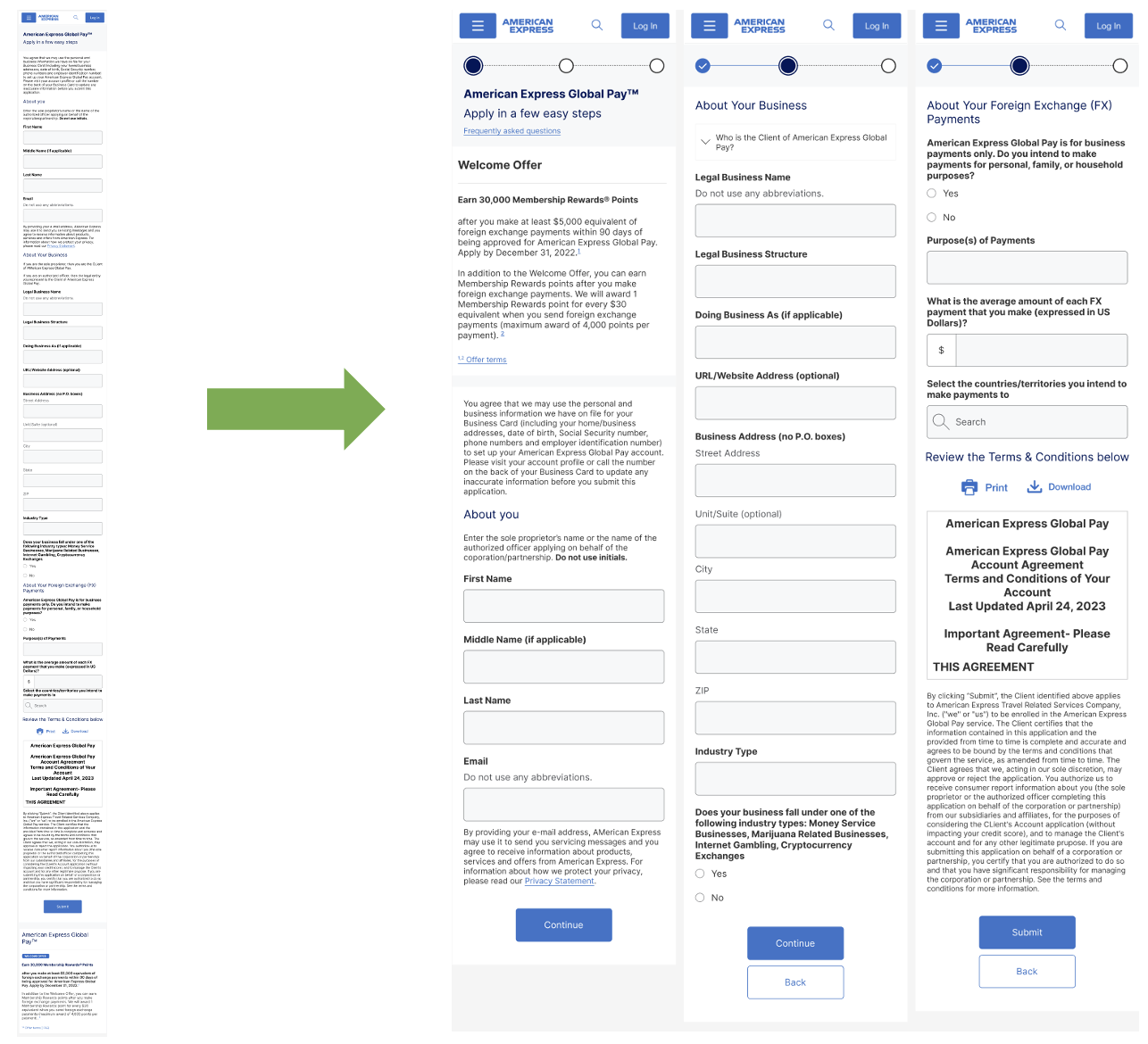 Designed and launched an optimized mobile page grouping, a new welcome offer component, and accessible footnotes in desktop/mobile for US Global Pay eApply, which was added to the Acquisition Design Library (ADS).