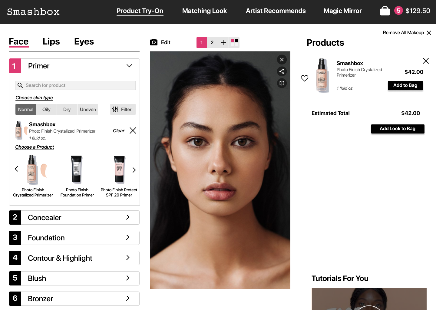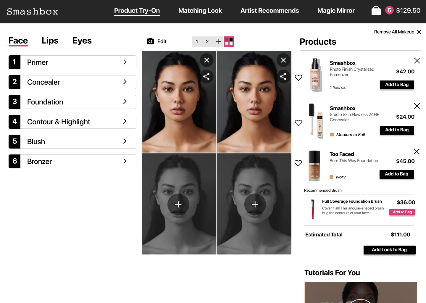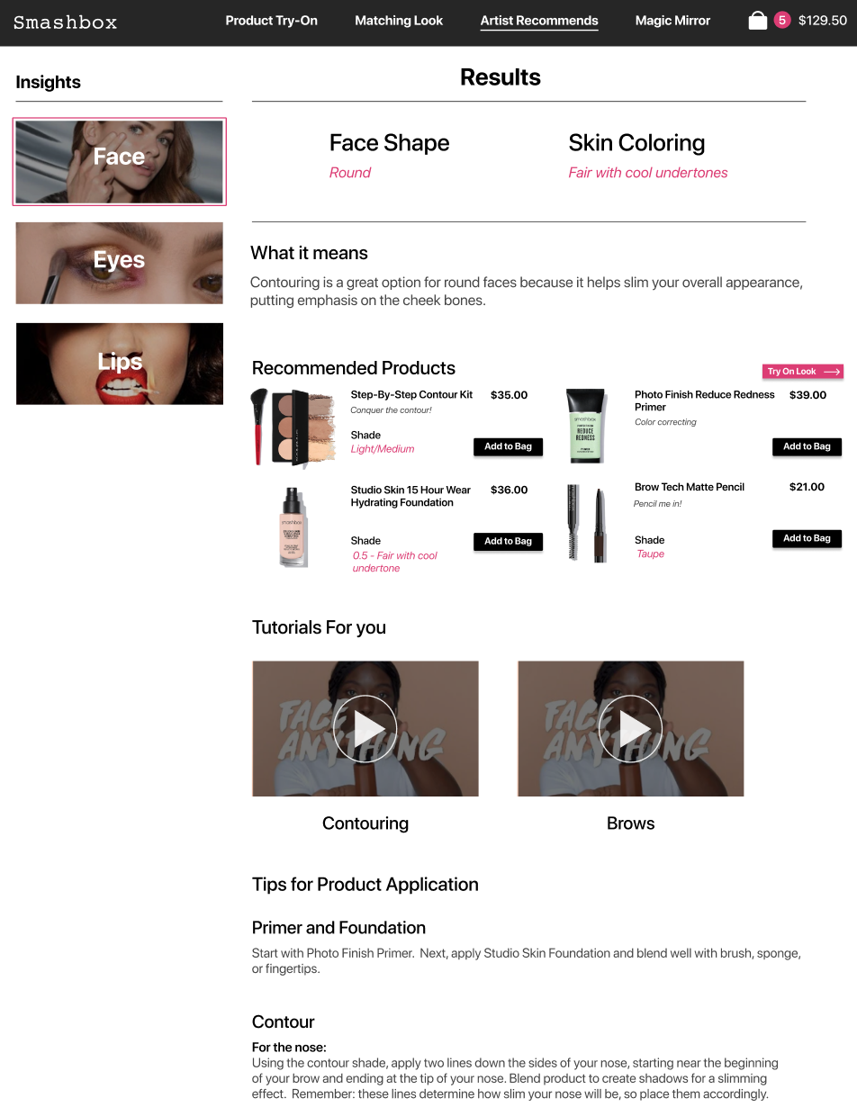 After uploading your picture and filling out a quick questionnaire about your makeup needs and wants, the algorithm analyzes your face and gives the user personalized recommendations. I organized the navigation by parts of the face in order of how you’re supposed to apply makeup products. Each page gives you recommended products, video tutorials, and written application instructions. From the recommended products, you can go straight to virtual product try on.