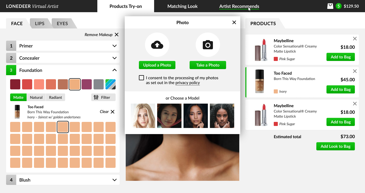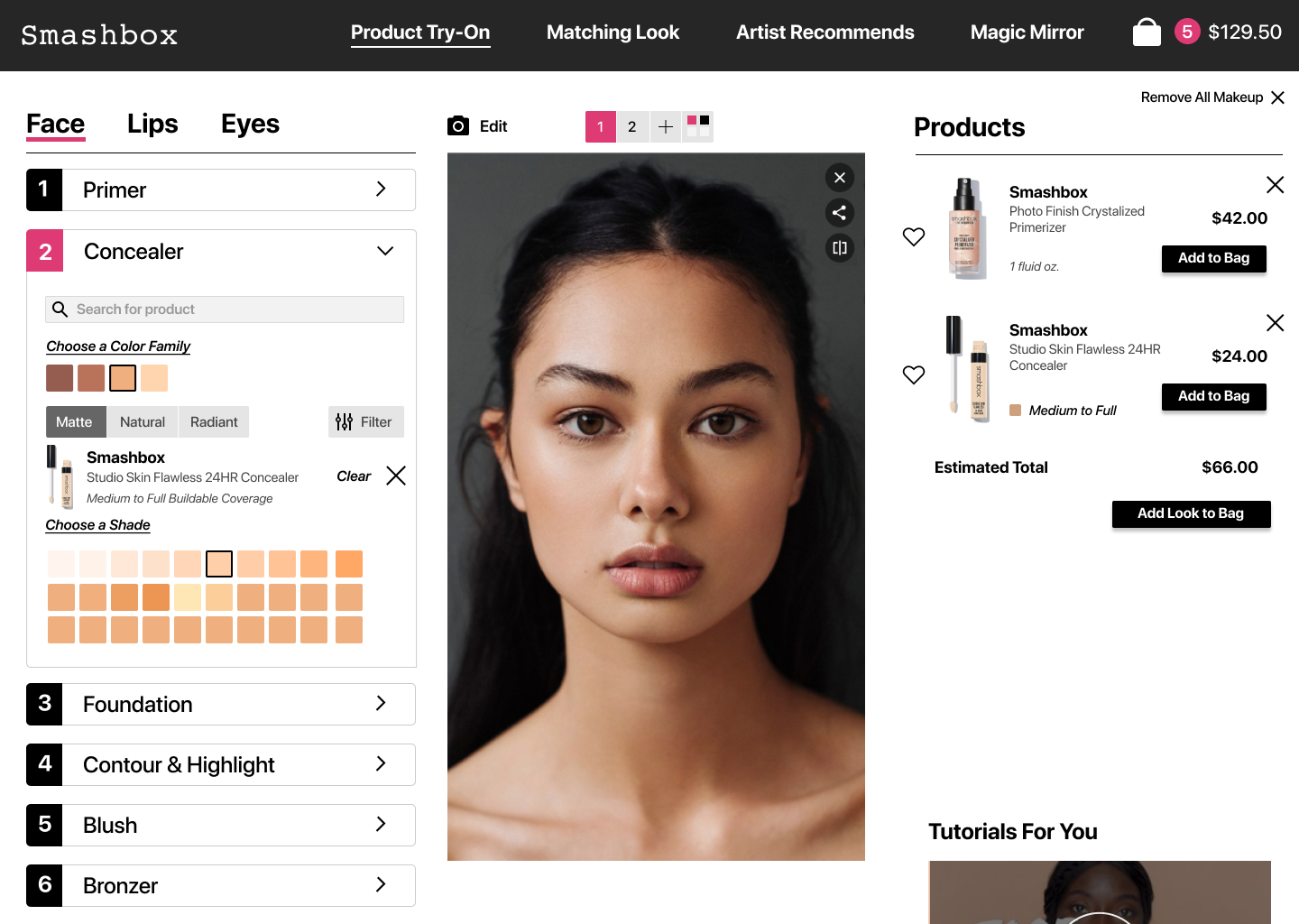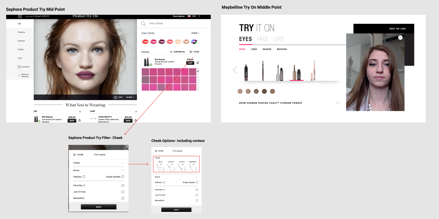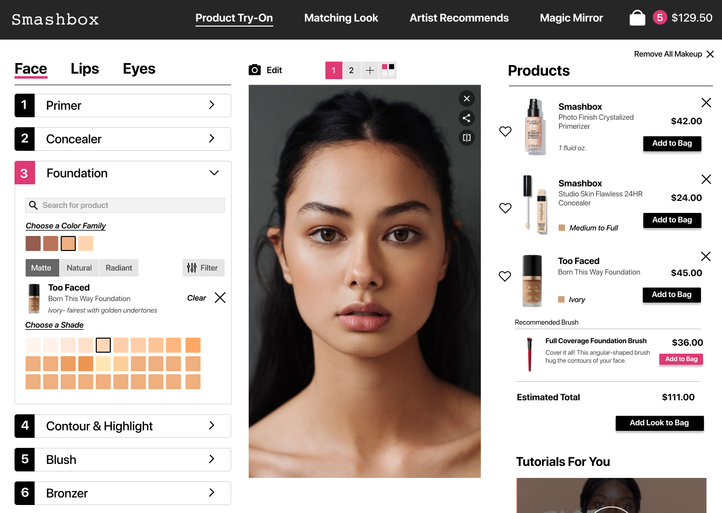 After uploading your picture and filling out a quick questionnaire about your makeup needs and wants, the algorithm analyzes your face and gives the user personalized recommendations. I organized the navigation by parts of the face in order of how you’re supposed to apply makeup products. Each page gives you recommended products, video tutorials, and written application instructions. From the recommended products, you can go straight to virtual product try on.