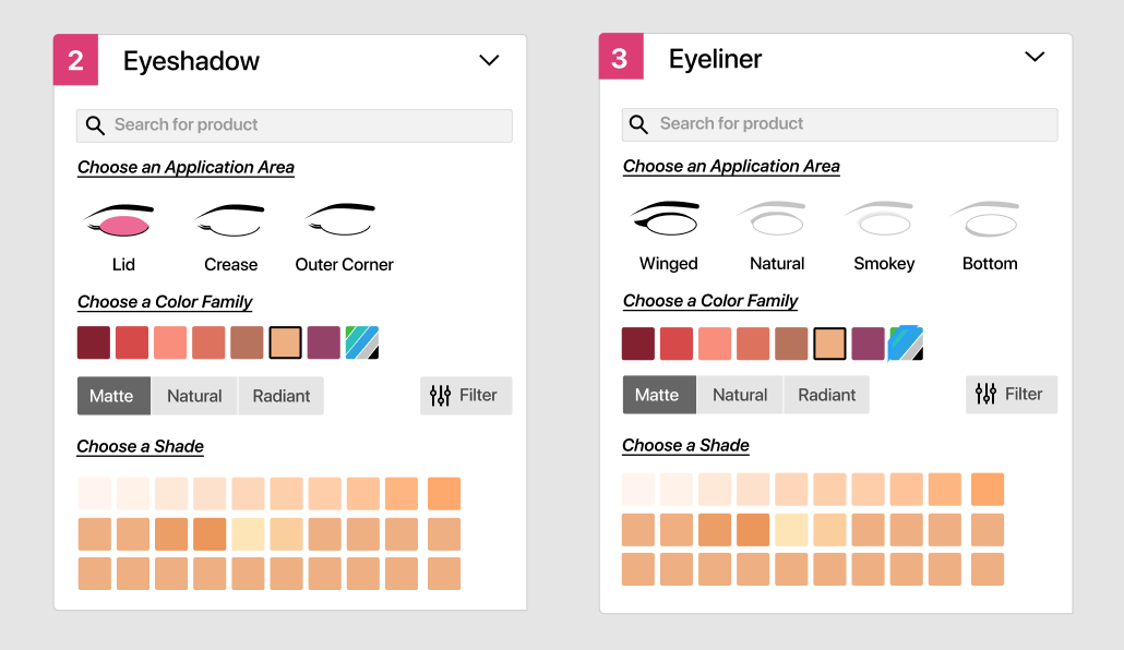 For Estée Lauder, they want to be able to implement this web app for all of their brands, not just their site. With this in mind, I decided to have 2 options for product browsing based on the amount of products in stock: 1 by product and another by color.
